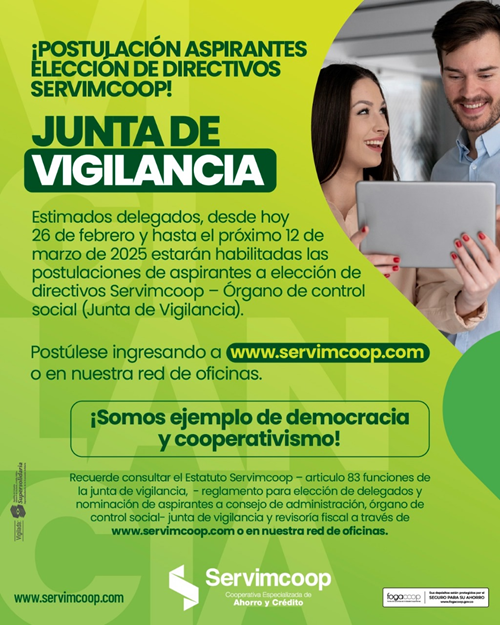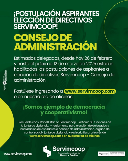 En cumplimiento con el cronograma del acuerdo de convocatoria No. 001 de 27 de enero de 2025, se informa a las oficinas que los delegados interesados en postularse para los cargos de Consejo de Administración y Junta de Vigilancia para el período 2025-2027 deben revisar el artículo 9 del Reglamento para la Elección de Delegados y Nominación de Aspirantes, disponible en nuestra página web, así mismo, los estatutos de Servimcoop.